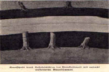 In der Tat waren solche Stämme seither vielfältig gefunden worden, und gerade sie hatten zu dem Bilde wirklicher großer Urwälder von damals geführt.  Daß es Stämme von farnartigen Gewächsen sein sollten, gab kein Hemmnis.  Ist auch uns hier im Norden das Farnkraut wirklich nur ein „Kraut“, so braucht man bloß die Tropen zu besuchen (oder bei uns das Gewächshaus eines botanischen Gartens), um dem „Farnbaum“, dem „Baumfarn“ auch heute noch in herrlichster Entfaltung zu begegnen. (Top P.36).  Für die Schlepptheorie hatte so ein Stamm von damals auch an sich weiter kein Hindernis. Wo an der Grenze der eigentlichen, ganz zermahlenen Kohlen Schwemmschicht in der mehr sandigen Schlammbank ein zartes Fiederblatt oder der Flügel einer Heuschrecke, die einst darauf gesessen, sich erhalten hatte : warum da nicht auch ein ganzer mitgestrudelter Baumstamm?  Aber diese Stämme erlaubten sich doch noch etwas höchst Ärgerliches, das entschieden gar nicht im Sinne der Theorie war.