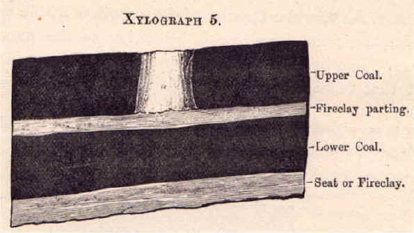 "The superincumbent beds, f and h (separated by the thin layer of  blue clay, g), in addition to the upright stems with their roots and rootlets attached, growing at different levels, contain also vast quantities of flattened stems of Sigillariae, Calamites and Lepidodendron, lying in ... oblique and horizontal positions and a great variety of Ferns, & c. Immediately  under the roots of one of the trees I found Neuropteris cordata with basal leaflets, two species of Sphenophyllum two of Pecopteris, Sphenopteris crenata, Asterophyllites, and Pinnularia capillacea." 77 **